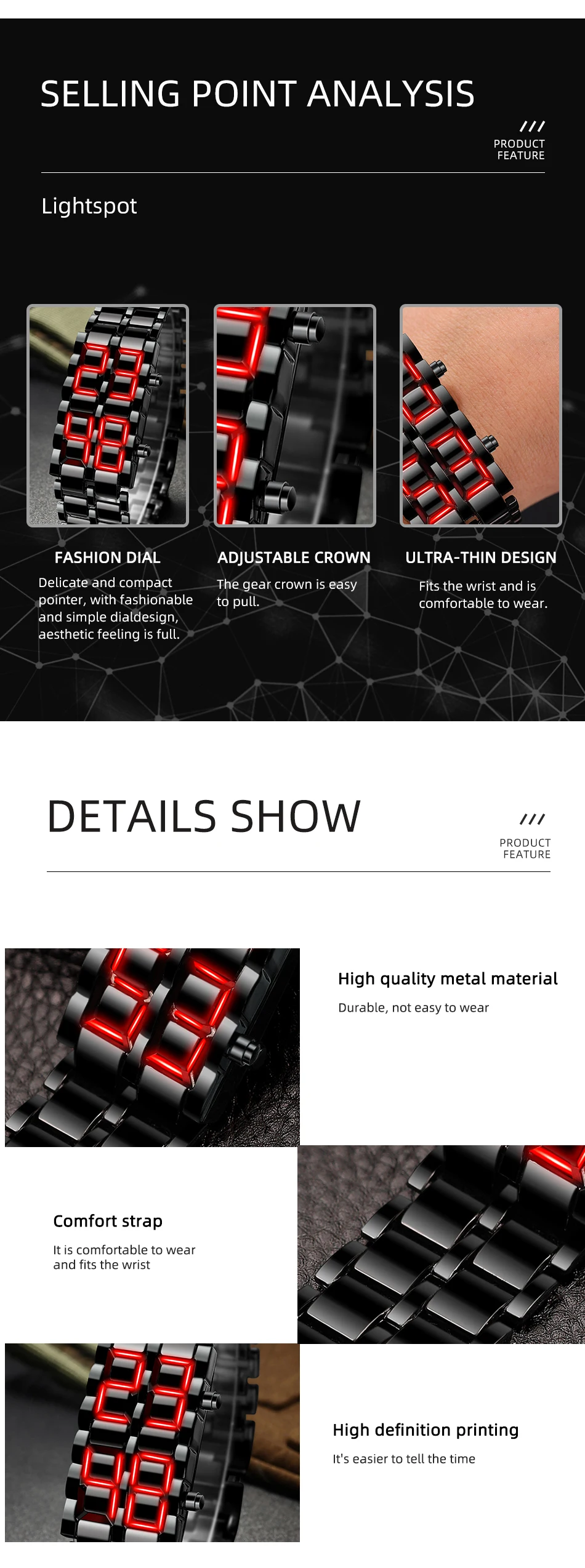 LED Digital Watch looks like a common metal bracelet at normal condition, but dark-blue light will be sent out just like lava while LED is lighting.